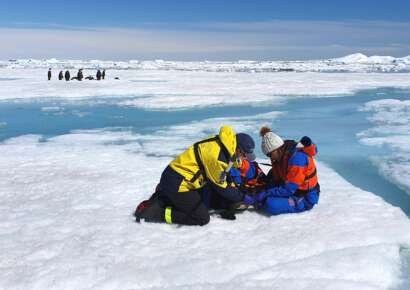 Dra. Juliana Vianna y Dra. Fabiola León durante estudio de pingüino emperador en la Antártica. Foto: Nadia Politis